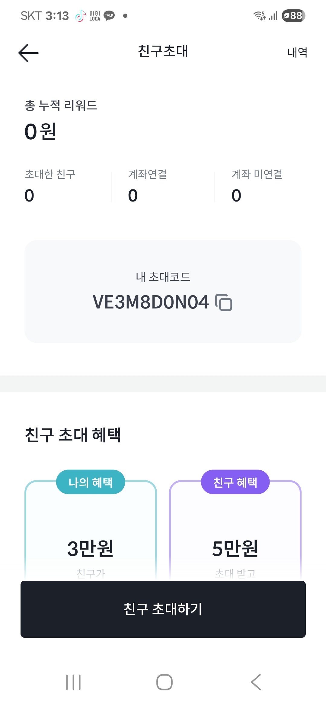 즉, 가입하고 초대코드만 입력해도 최소 5만 원은 무조건 확보할 수 있는 셈입니다. 단, 반드시 국민은행 계좌를 연동해야만 혜택이 주어진다는 점을 꼭 기억해 두셔야 합니다.